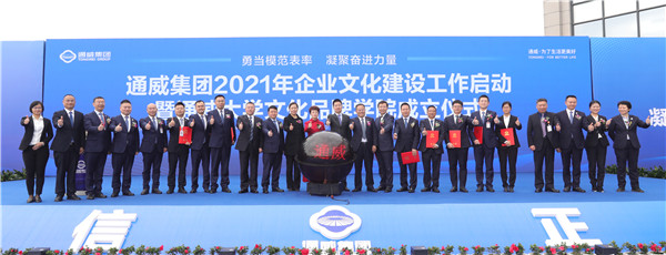 326日,通威集團2021年企業文化建設工作啟動暨通威大學文化品牌學院成立儀式在樂山永祥新能源隆重舉行。通威集團禚玉嬌總裁,通威股份董事長謝毅、總裁郭異忠,通威股份董事、永祥股份董事長段雍,集團副總裁、集團企業文化建設專項工作小組執行組長黃其剛,集團財務總監肖吉華,股份財務總監周斌,通威股份人力資源總監、永祥股份副總經理易繼成,通威新能源執行董事兼總經理邱艾松,永祥股份總經理兼永祥新能源總經理李斌,通威太陽能副總經理楊文棟、永祥股份董事兼首席技術官甘居富、永祥股份財務總監袁仕華、永祥股份副總經理袁中華、通威新能源有限公司總經理助理何一弘、通威股份傳播策劃部部長馮暢,通威集團工會主席、通威大學執行副校長、集團企業文化建設專項工作小組執行組長張紅纓等領導出席。來自集團、股份管理總部,永祥股份及各體系高管、員工共500余人參加儀式。