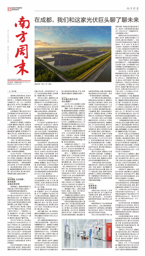 8月5日,最新推出的《南方周末》以《在成都,我們和這家光伏巨頭聊了聊未來》為題,對通威進行了整版專題報道,報道聚焦“漁光一體”、光伏行業、智能制造等方面,并專訪了劉漢元主席。