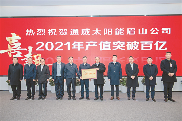 2021年,通威太陽能眉山公司實現(xiàn)產(chǎn)值101億元,成為眉山市第一家百億企業(yè)。1月25日,通威太陽能眉山公司成為眉山市首家百億企業(yè)授牌儀式在眉山基地展廳隆重舉行。眉山市委書記胡元坤,通威集團(tuán)董事局劉漢元主席出席授牌儀式。市委副書記、市長黃河主持儀式。授牌儀式上,黃河市長指出,眉山市委市政府提出“制造強(qiáng)市、開放興市、品質(zhì)立市”,傾力打造“1+3”現(xiàn)代工業(yè)體系。通威太陽能作為全球光伏行業(yè)領(lǐng)軍企業(yè),自2019年3月落戶眉山以來,從談判、簽約到投產(chǎn),創(chuàng)造了“通威速度、眉山速度”。從2020年4月投產(chǎn)至今,不到兩年的時間,2021年便實現(xiàn)了產(chǎn)值超100億元,再次創(chuàng)造了“通威速度”,成為全市首個產(chǎn)值突破百億的企業(yè)。我們向漢元主席及漢元主席領(lǐng)導(dǎo)的通威集團(tuán)表示熱烈的祝賀,并對通威太陽能在眉山工業(yè)經(jīng)濟(jì)發(fā)展中作出的貢獻(xiàn)表示衷心的感謝。