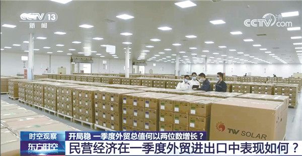 4月13日,央視《新聞聯(lián)播》播出“一季度我國(guó)外貿(mào)開(kāi)局平穩(wěn)”報(bào)道,央視記者赴通威太陽(yáng)能金堂基地現(xiàn)場(chǎng)采訪,實(shí)地了解企業(yè)外貿(mào)出口情況。同日,央視《東方時(shí)空》在報(bào)道“我國(guó)民營(yíng)經(jīng)濟(jì)一季度發(fā)展情況”時(shí),也聚焦了通威太陽(yáng)能。截至目前為止,今年央視已經(jīng)4次聚焦通威新能源產(chǎn)業(yè)發(fā)展成果和創(chuàng)新實(shí)力,展示了通威為代表的中國(guó)光伏企業(yè)強(qiáng)勁的發(fā)展實(shí)力。