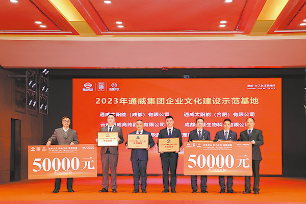 作為2023年企業(yè)文化亮點(diǎn)活動,通威在全集團(tuán)范圍內(nèi)開展年度企業(yè)文化示范基地的評選。通威太陽能(成都)有限公司、通威太陽能(合肥)有限公司、云南通威高純晶硅有限公司、成都通宇物業(yè)管理有限公司、成都通威生物科技有限公司獲評“2023年度通威集團(tuán)企業(yè)文化建設(shè)示范基地”。盛典現(xiàn)場還對“效率優(yōu)先 陽光正向 監(jiān)督保障”主題征文獲獎作品進(jìn)行表彰。永祥股份龍小龍榮獲一等獎、通威太陽能成都公司徐嘉等2人榮獲二等獎、通威農(nóng)發(fā)張子顏等3人榮獲三等獎;通宇物業(yè)馮小蓉等10人榮獲優(yōu)秀獎。