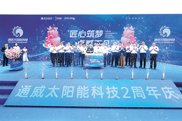5月20日,通威太陽能科技2周年慶典在鹽城基地隆重舉行。全國人大代表、全國工商聯副主席、通威集團董事局劉漢元主席特發來賀信。鹽城市副市長祁從峰,通威股份董事長、CEO劉舒琪,通威股份總裁助理、通威太陽能科技總經理蕭圣義等領導嘉賓出席,通威太陽能科技管理團隊及員工代表參加慶典活動,各基地線上觀看視頻直播,共同見證這一具有紀念意義的時刻。