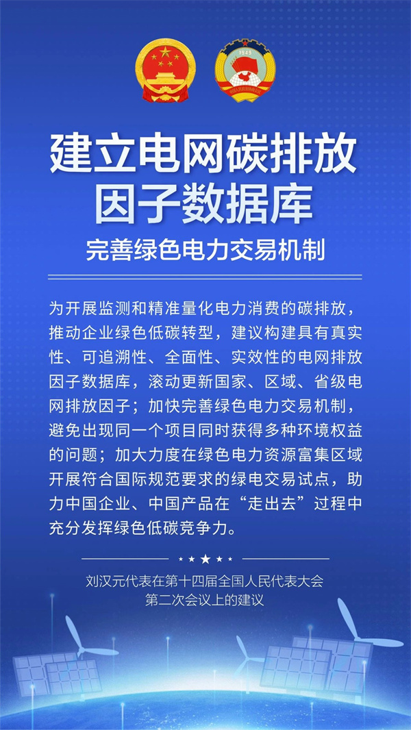 “建議加大力度在綠色電力資源富集區(qū)域開展符合國際規(guī)范要求的綠電交易試點,充分發(fā)揮綠色電力在降低企業(yè)或產(chǎn)品碳排放方面的作用,助力中國企業(yè)、中國產(chǎn)品在‘走出去’過程中充分發(fā)揮綠色低碳競爭力。”劉漢元代表說。