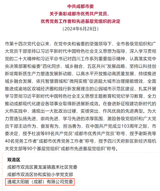 在中國共產黨成立103周年之際,成都市委、雙流區委公布了“兩優一先”表彰名單,通威太陽能(成都)有限公司黨委榮獲“成都市先進基層黨組織”,黨員羅蘭同志榮獲“雙流區優秀黨務工作者”稱號。