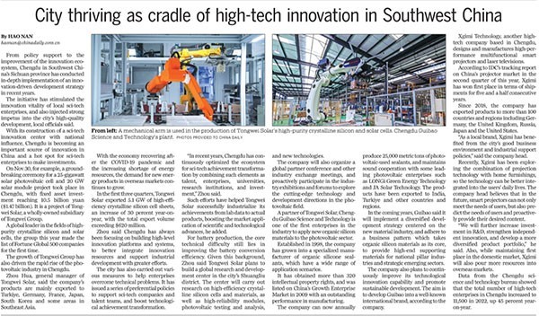 《中國日報》聚焦通威太陽科技創(chuàng)新與發(fā)展