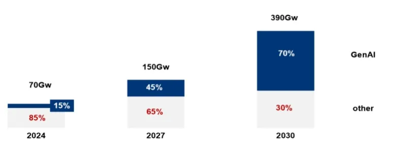 根據咨詢機構麥肯錫2024年的最新研究,AI對算力需求的拉動將直接帶動數據中心建設規模提速,同時帶來對電力需求的爆發式增長。保守估算,到2030年,全球數據中心服務器的能耗將高達390GW,而其中70%是被AI算力所消耗。