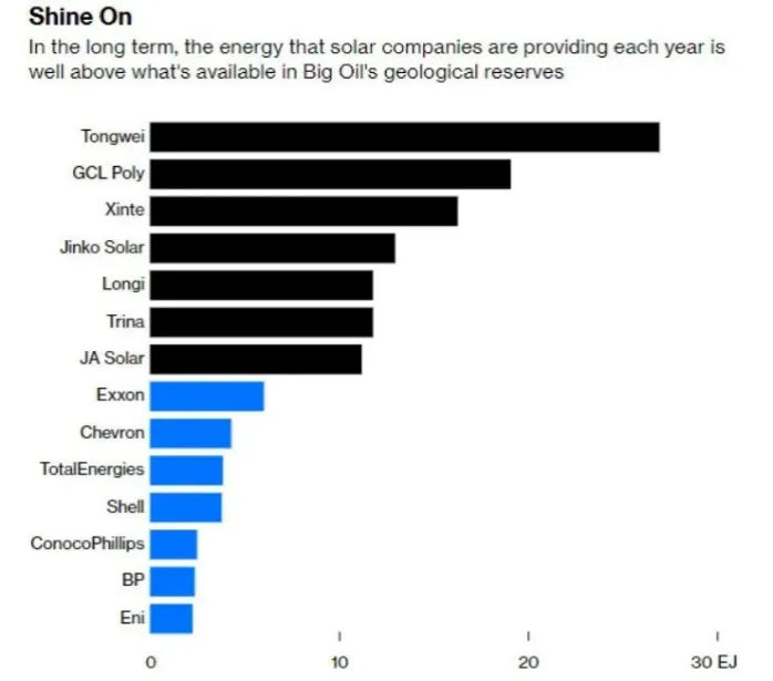 而排在最大的石油公司??松懊娴?,無一例外全是中國的光伏公司:通威股份、協鑫科技、新特能源、晶科能源、隆基綠能、天合光能、晶澳科技。