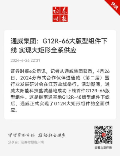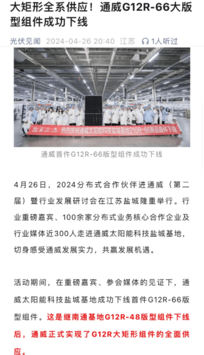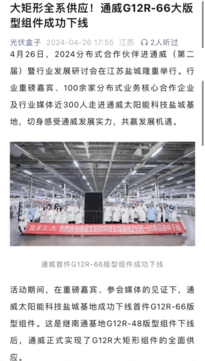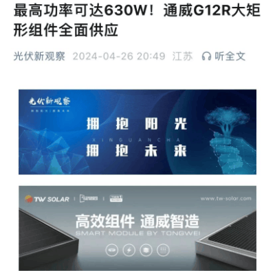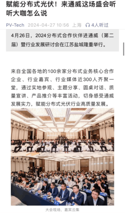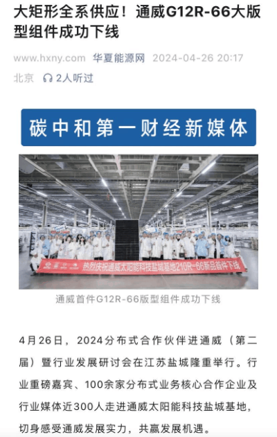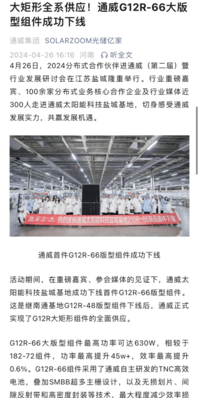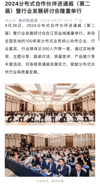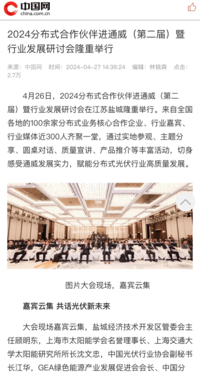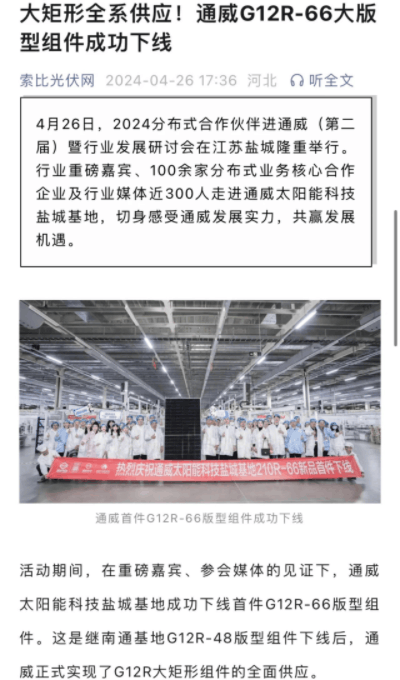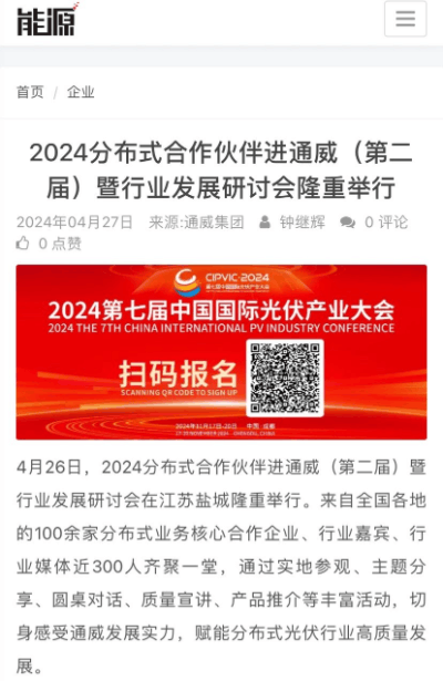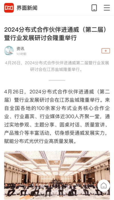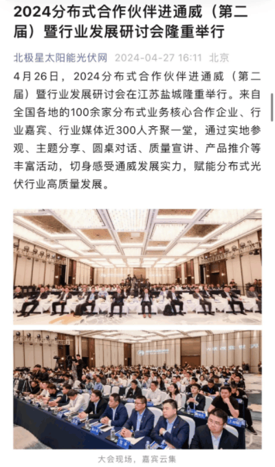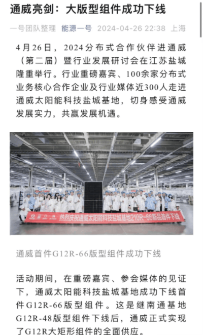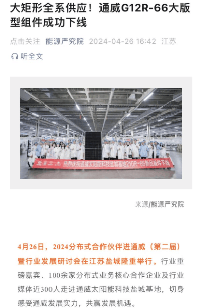 2024分布式合作伙伴進通威(第二屆)暨行業(yè)發(fā)展研討會、通威G12R-66大版型組件成功下線,受到中國能源報、中國電力報、《能源》雜志、能源一號、黑鷹光伏、國際能源網(wǎng)、索比光伏網(wǎng)、華夏能源網(wǎng)、PV-tech、集邦咨詢、北極星太陽能光伏網(wǎng)、世紀新能源網(wǎng)、ofweek太陽能光伏網(wǎng)、SOLARZOOM、光伏們、光伏盒子、能源嚴究院、光伏資訊、趕碳號科技、光伏見聞、全球光伏、分布式能源網(wǎng)、光伏薈、能源圈、能見、光伏新觀察、綠能新媒、草根光伏、江蘇經(jīng)濟報、鹽阜大眾報、鹽城電視臺等權(quán)威主流媒體、行業(yè)媒體的關(guān)注報道,賦能分布式光伏高質(zhì)量發(fā)展。