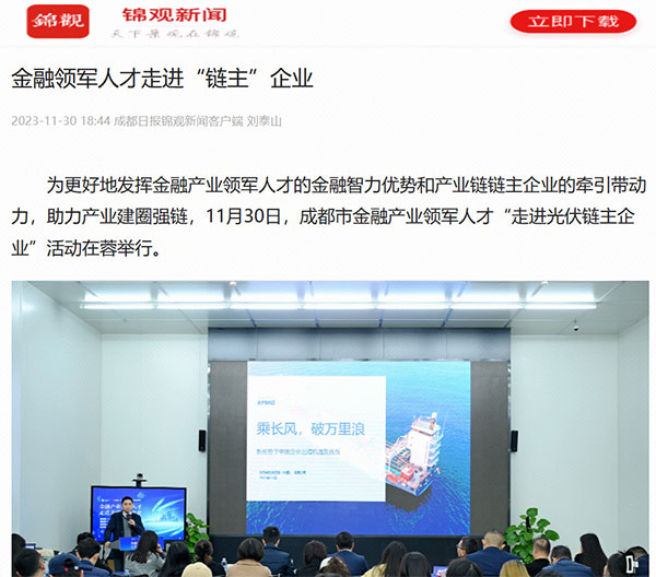 各媒體圍繞“金蓉鏈”金融顧問服務團專家、光伏產業(yè)鏈上企業(yè)、金融機構以及西南民族大學經濟學院組成的代表團一行在通威太陽能金堂基地進行的實地參觀、座談分享及企業(yè)路演等內容進行詳細報道,并指出,產業(yè)領軍人才和產業(yè)鏈鏈主企業(yè)共同肩負著城市發(fā)展的使命和擔當,此次活動是圍繞實施產業(yè)建圈強鏈行動,充分發(fā)揮重點產業(yè)鏈鏈主企業(yè)、行業(yè)協(xié)會等市場主體作用,引導優(yōu)質項目、人才資源、創(chuàng)新要素向重點產業(yè)鏈加速匯聚,推動人才鏈、產業(yè)鏈、創(chuàng)新鏈深度融合,助力產業(yè)高質量發(fā)展的又一落地舉措。