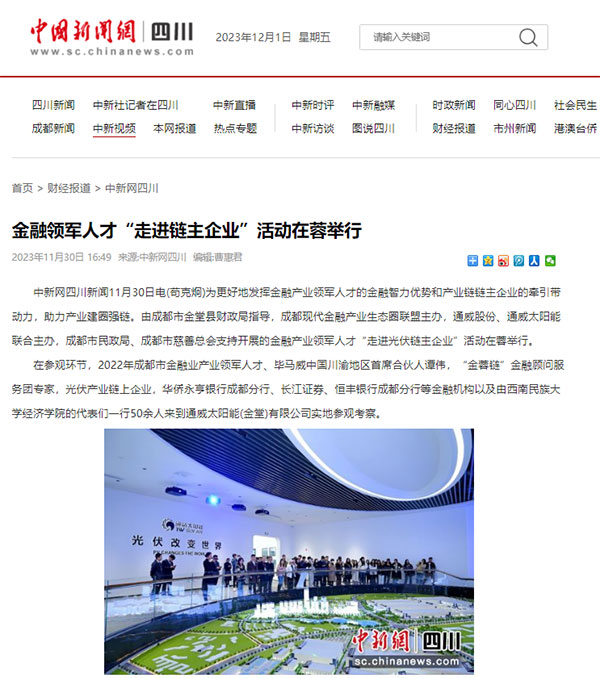 為更好地發(fā)揮金融產業(yè)領軍人才的金融智力優(yōu)勢和產業(yè)鏈鏈主企業(yè)的牽引帶動力,助力產業(yè)建圈強鏈,11月30日,由金堂縣財政局指導,成都現(xiàn)代金融產業(yè)生態(tài)圈聯(lián)盟主辦,通威股份、通威太陽能聯(lián)合主辦,成都市民政局、成都市慈善總會支持開展的金融產業(yè)領軍人才“走進光伏鏈主企業(yè)”活動走進通威太陽能金堂基地,并獲得中國新聞網、界面新聞、成都日報等多家媒體的聚焦報道。