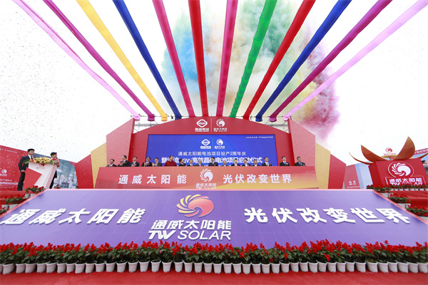▲2015年11月18日,通威舉行太陽能電池項(xiàng)目投產(chǎn)2周年慶暨雙流5GW高效晶硅電池項(xiàng)目啟動(dòng)儀式